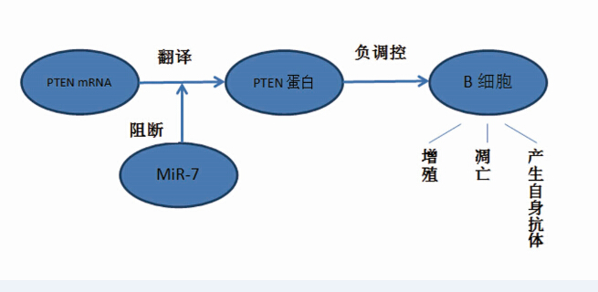 研究组分析了新诊断且未用药的红斑狼疮患者外周血中的B细胞,新发现多个微核糖核酸(miRNA)特别是miR-7对PTEN蛋白生成起到阻断作用,miR-7异常增高,将导致PTEN蛋白水平下降,对B细胞的免疫负调控作用降低。从而使B细胞异常活跃,增殖过多,凋亡减少,产生大量自身抗体(见示意图)。研究组还通过实验证明了PTEN在miR-7与B细胞间起到“桥梁”作用,如果人为敲低PTEN,再干预miR-7对B细胞不会产生调控作用。由此证实了通过干预miR-7和PTEN,将达到纠正免疫功能的作用。
