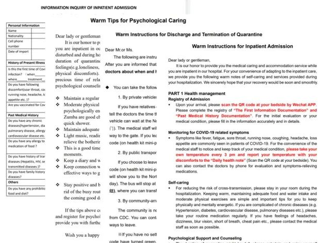 协和医疗队承担了管理境外输入患者任务,在过去的1个月之内,共收治了来自十余个国家的外籍患者近30例,其中大部分患者无法用中文沟通。为此,医疗队特别编译了英文版《入院温馨提示》《心理健康小贴士》《入院评估表》《微信注册方法》《出院温馨提示》等。同时,队员们用流畅的英文交流,与外籍患者的沟通零障碍,得到了他们对防疫及治疗的理解和配合。
