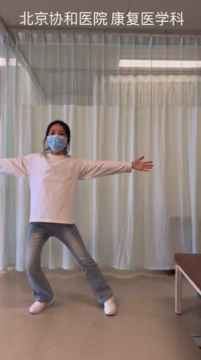 站立位,双上肢外展,与此同时右腿向右侧做弓字步迈开,脚尖向右侧,躯干转向右侧,重心向右脚转移,回到站立位,左右腿交替进行。可面向镜子,调整自己的姿势是否对称。